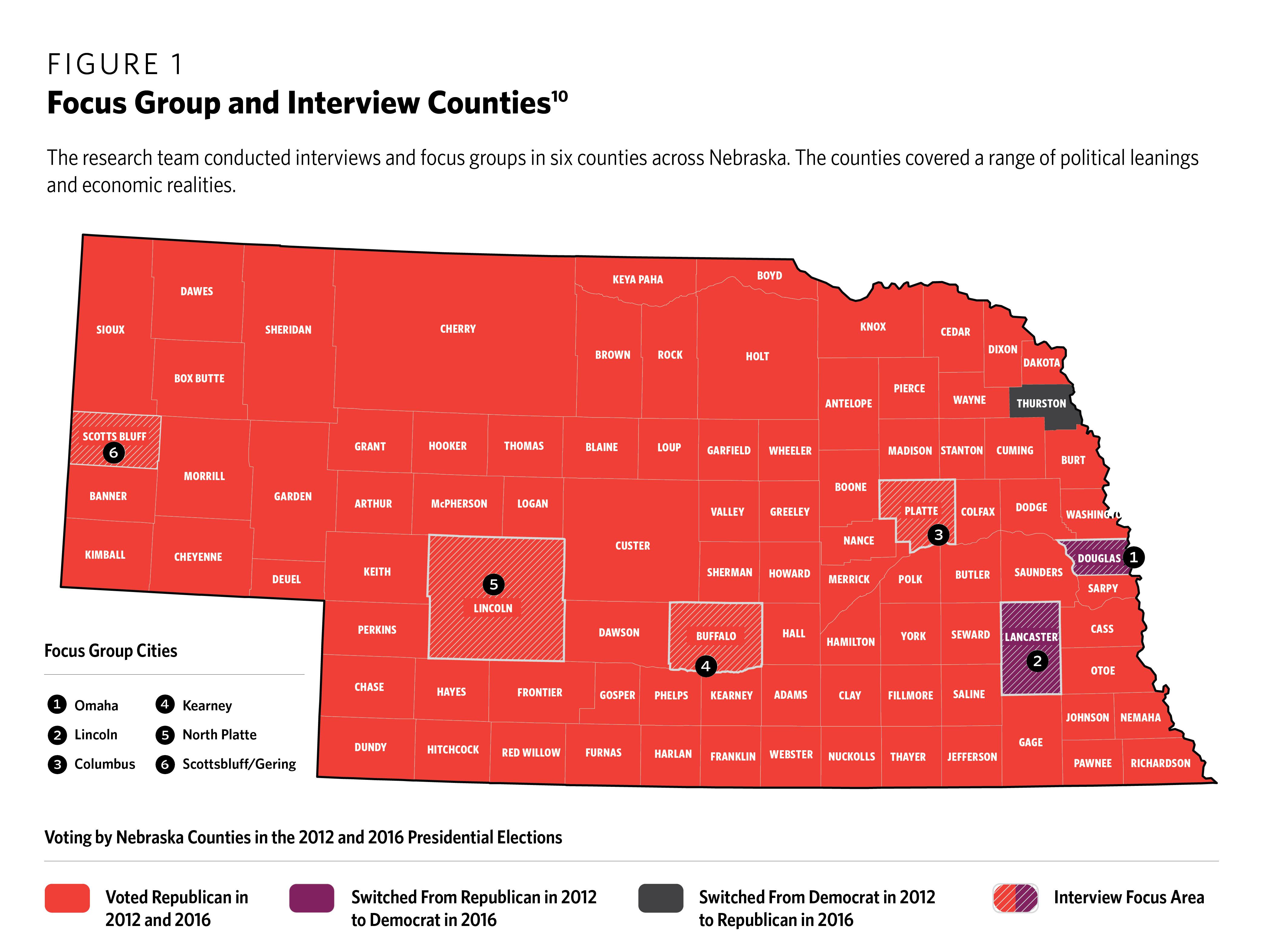 Having covered Ohio, a major manufacturing swing state, and Colorado, a new economy state that has trended blue in recent years, the task force decided to round out the trio with an agricultural state that traditionally votes Republican. Few other U.S. states’ economies revolve around agriculture as much as Nebraska’s does.1 Its governor and entire congressional delegation are all Republicans. The Republican presidential candidate has won the state in every election but one (1964) since World War II.2