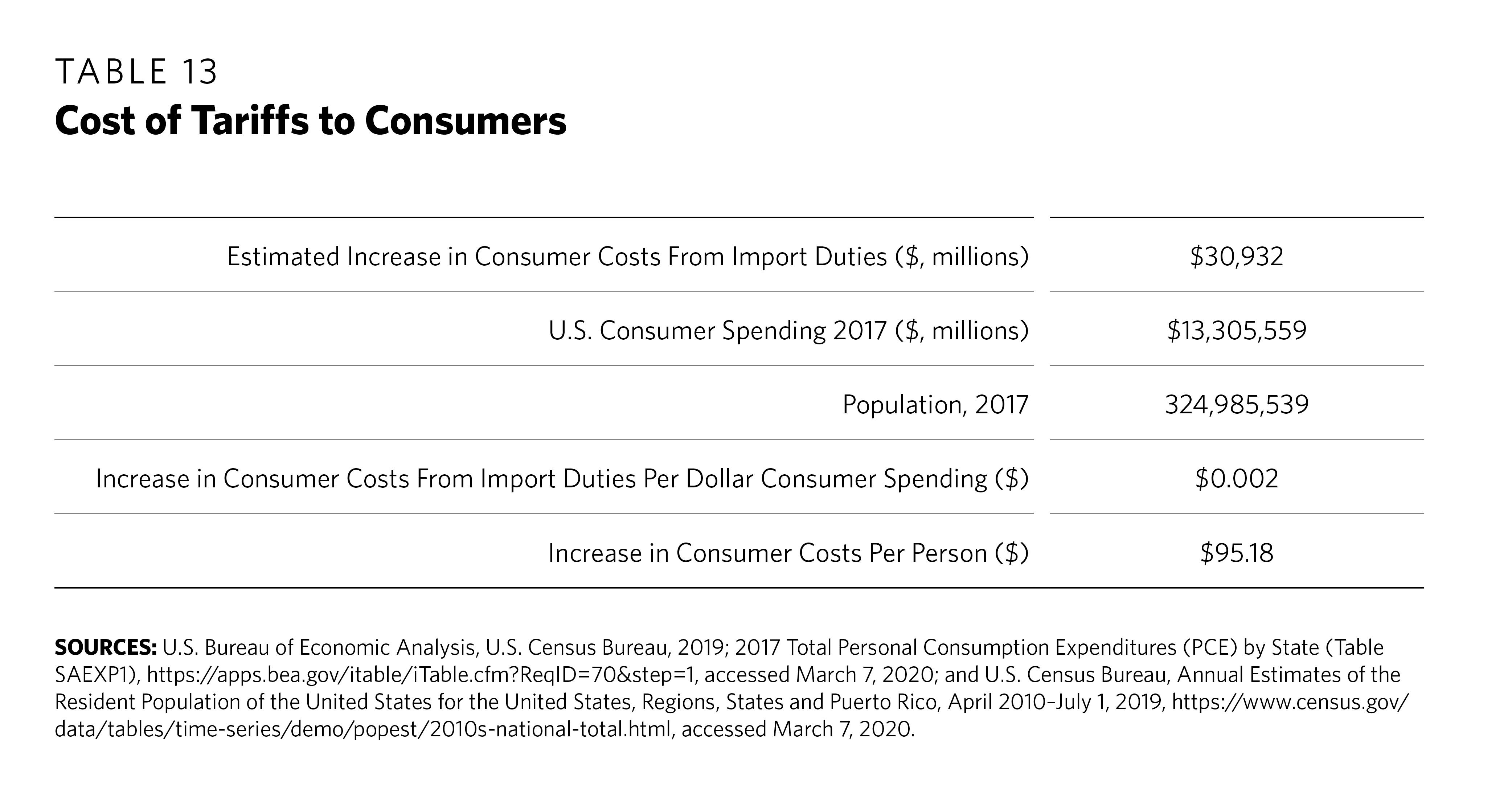 At a per-person rate, the cost of 2017 import tariffs was $95.18 for U.S. consumers (see Table 13). This additional cost is equivalent to $0.002 (one-fifth of one cent) per $1 of U.S. consumer expenditures.