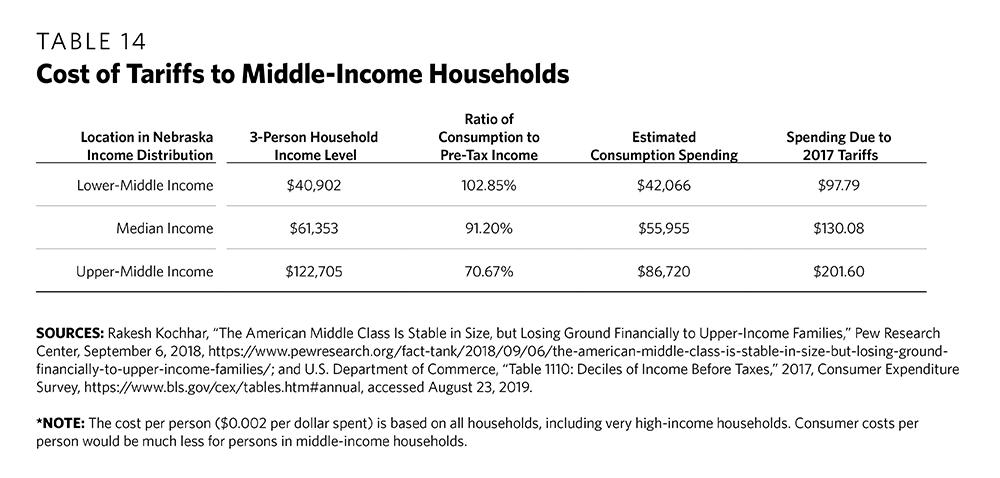 Next, to predict consumer costs for middle-class households in Nebraska specifically, household-income data are used. Following definitions used by the Pew Research Center, middle-class households are defined as middle-income, ranging from the lower end of middle-income (two-thirds of the median income) to the higher end of middle-income (double the median income) in 2016.23 Table 14 estimates consumer costs for middle-income, three-person households because the average household size in Nebraska is 2.46 people.24 Estimates are made by applying the tariff cost per dollar of U.S. domestic consumption in Table 13 ($0.002 per dollar spent) to consumer expenditures for households at three income levels: $40,902, $61,353, and $122,705.25