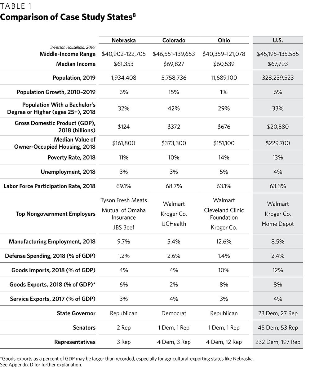 As in the cases of Ohio and Colorado, this report focuses on perceptions of the economic impact of foreign policy on the middle class and the ways in which those perceptions stack up against relevant economic data; this is because it is not feasible to model quantitatively the total economic impact of all U.S. foreign policy on a specific income group in a single state. There are far too many variables involved, including the wars the United States wages or prevents, the stability for the global economy it provides, the commerce it enables, the trade in goods and services it conducts, the foreign investment it makes or receives, the aid it delivers, and the friendly relations it forges.