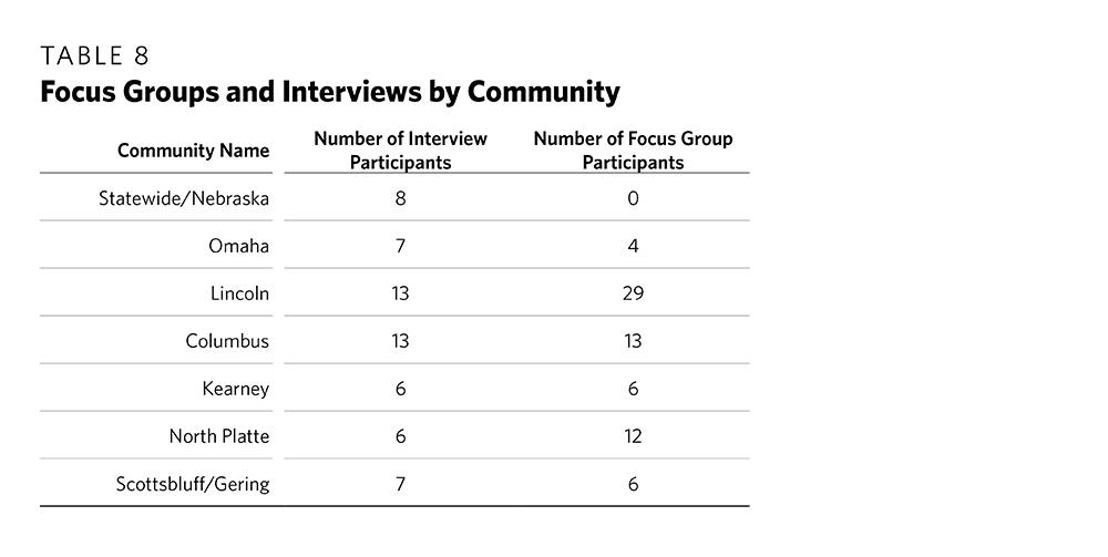 In addition to interviews and focus groups, the research team considered information from the recently completed Blueprint Nebraska survey. Blueprint Nebraska is a strategic plan developed by a group of business, industry, and civic leaders who released a report, which was partly based on a survey of the economic concerns of Nebraskans and which offered a detailed set of proposals for addressing them. The Blueprint Nebraska plan was established based on a survey that gave Nebraskans the opportunity to provide feedback on various topics including agriculture; banking and finance; community vitality; educational attainment; energy and natural resources; entrepreneurship; healthcare; housing; leadership, diversity, and inclusion; manufacturing; mega-sites for future development; military and veterans’ affairs; taxation and incentives; technology and innovation; transportation; and workforce.